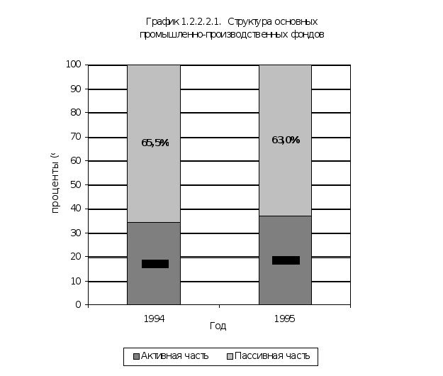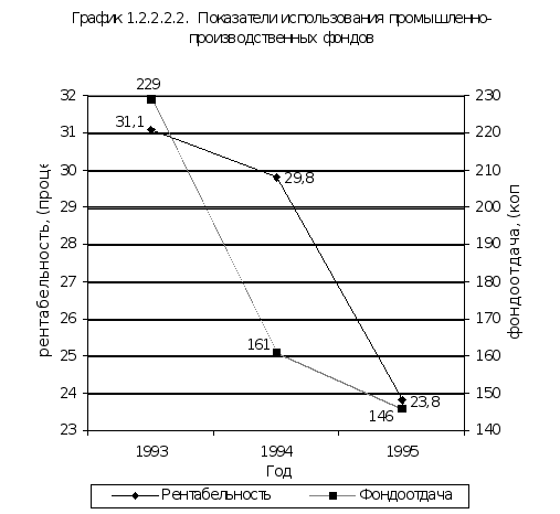 Из таблицы 1.2.2.2.5. следует, что фондоотдача и рентабельность основных промышленно-производственных основных фондов продолжают снижаться. Фондоотдача снизилась в 1995 г. по сравнению с 1994 г. на 28,4 % и на 9,3 % в 1996 г. по сравнению с 1995 г. По рентабельности основных промышленно-производственных фондов эти показатели составили 47,9 % и 20,1 % соответственно. Основной причиной снижения вышеперечисленных показателей является снижение товарного выпуска в сопоставимых ценах. На что, в свою очередь, повлияли плановые ремонты по следующим объектам: