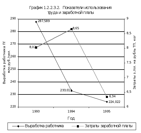 Данные таблицы 1.2.2.3.9. свидетельствуют о нерациональном расходовании средств на оплату труда в 1995 г., поскольку темп прироста среднемесячной заработной платы одного работающего опережал темп прироста производительности труда в 1,22 раза. В 1996 г. ситуация изменилась, что привело к меньшему темпу прироста заработной платы работника ППП по сравнению с приростом выработки работника ППП. Это является положительной тенденцией. ОБЩИЙ ВЫВОД ПО АНАЛИЗУ ИСПОЛБЗОВАНИЯ ТРУДА И ЗАРАБОТНОЙ ПЛАТЫ. Численность работающих на АО “Х“ сократилась в 1995 г. на 190 человек, в 1996 г. на 26 человек. Снижение численности происходило в части непромышленного персонала в связи с передачей в муниципальную собственность детских учреждений в количестве шести в 1995 г. и двух в 1996г. Кроме этого в 1996 г. было ликвидировано подсобное хозяйство. Рост численности ППП произошло из-за отказа от услуг подрядных организаций и расширения ремонтной службы предприятия, укомплектования специализированных ремонтных участков. Коэффициенты движения рабочей силы свидетельствуют о ее значительной подвижности. Однако их значения с каждым годом снижаются. Достаточно высокие значения коэффициента текучести, при критическом значении 10 %, объясняются тяжелыми условиями труда, несоответствующей им заработной платой и в связи с этим увольнением рабочих по собственному желанию. В 1994-1996 г.г. на АО “Х“ принимались меры по снижению уровня текучести. За период 1995-1996 г.г. наблюдалось улучшение всех показателей использования фондов рабочего времени, на фоне их снижения в период 1994-1995 г.г. Резерв времени, который может быть использован для увеличения выпуска продукции, составляет 21 533 чел-дней. В структуре календарного фонда рабочего времени происходили изменения. Если в 1995 г. наблюдались его незначительные ухудшения, то в 1996 г. ситуация изменилась в лучшую сторону. Увеличилась доля фактически отработанного времени при сокращении доли неявок. В динамике за три года наблюдалось снижение производительности труда однако в 1995 г. снижение происходило более высокими темпами, чем в 1996 г. Снижение среднегодовой выработки рабочего в 1996 г. произошло за счет снижения среднечасовой выработки, на что повлияло недоиспользование оборудования в связи с проводимыми плановыми ремонтами и неритмичными поставками угля. В 1995 г. возросли удельные затраты заработной платы ППП на рубль товарной продукции на 8 % (с 0,8 % копеек до 8,65 копеек), в 1996 г. удельные затраты заработной платы ППП на рубль товарной продукции снизились до 6,34 копеек, что является положительной тенденцией. В 1994-1996 г.г. произошли значительные изменения в структуре фонда оплаты труда. Если в 1995 г. на долю оплаты труда в соответствии с трудовым вкладом приходилась большая часть (98,8 %), чем в 1994 г., то в 1996 г. этот показатель составил лишь 81 %. Соответственно в 1995 г. значительно возросла доля фонда потребления, распределяемого в форме выплат и льгот до 19 %. Доля средств на непосредственную оплату труда по прежнему остается на низком уровне. В 1996 г. темп прироста выработки одного работника ППП превышала темп прироста его заработной платы, что свидетельствует о рациональном расходовании средств на оплату труда.