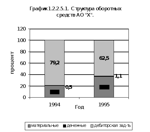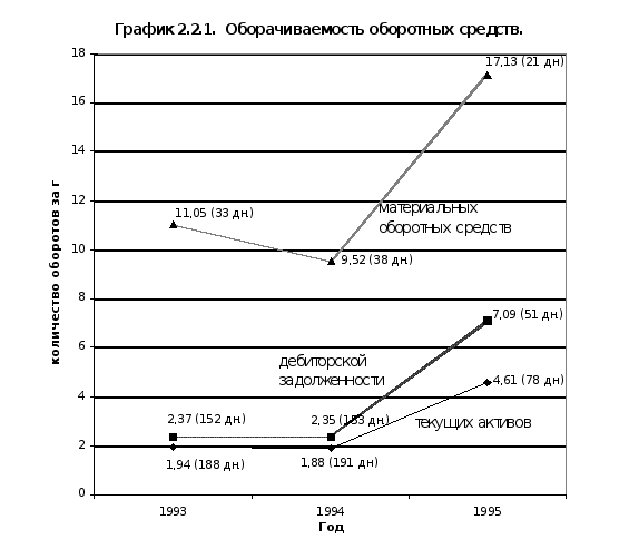Из таблицы 2.2.1. следует, что общая сумма оборотных средств за год выросла на 17 351 870 тыс. руб., или на 21,4 %. При этом рост произошел за счет производственных запасов (сырья и материалов) на 7 869 724 тыс. руб., или 91 %, сумм НДС по приобретенным ценностям на 5 737 442 тыс. руб., или в 2,8 раза, сумм расходов будущих периодов на 5 737 266 тыс. руб. Одновременно произошло снижение дебиторской задолженности на 2 494 272 тыс. руб. или 3,9 %, сумм по статье “Животные на выращивании и откорме“ на 89 249 тыс. руб. в связи с ликвидацией убыточного подсобного хозяйства, по статье “Товары“ на 1 470 787 тыс. руб. Прочих оборотных средств (расчеты с подотчетными лицами и др.) АО “Х“ не имеет. Анализируя изменения структуры размещения оборотных средств, можно сделать вывод, что в отчетном году по прежнему остается наибольшая доля дебиторской задолженности 62,7 %, хотя она сократилась за 1996 г. на 16,6 %. Доля производственных запасов увеличилась на 6,8 % и составила 16,8 %, соответственно выросла доля сумм НДС и СН по приобретенным ценностям на 5,3 %. Доля расходов будущих периодов на конец года увеличилась до 5.8,%. Таким образом, за 1996 г. наблюдалось изменение структуры оборотных средств. Эффективность использования оборотных средств характеризуется, прежде всего, их оборачиваемость. Оборачиваемость оборотных средств исчисляется продолжительностью одного оборота в днях (оборачиваемость оборотных средств в днях) или количеством оборотов за отчетный период (коэффициент оборачиваемости). Продолжительность одного оборота в днях представляет собой отношение суммы среднего остатка оборотных средств к сумме однодневной выручки за анализируемый период. Коэффициент оборачиваемости средств характеризует размер объема выручки от реализации в расчете на один рубль оборотных средств. Он определяется как отношение суммы выручки от реализации продукции к среднему остатку оборотных средств. Рост его свидетельствует о более эффективном использовании оборотных средств. Длительность нахождения средств в обороте определяется совокупным влиянием ряда разнонаправленных факторов внешнего и внутреннего характера. К числу первых следует отнести сферу деятельности предприятия (производственная, снабженческо-сбытовая, посредническая и др.), масштабы предприятия (в большинстве случаев оборачиваемость средств на малых предприятиях оказывается значительно выше, чем на крупных ) и ряд других. Не меньшее воздействие на оборачиваемость активов предприятия оказывает экономическая ситуация в стране и связанные с ней условия хозяйствования предприятия. Так, протекающие в стране инфляционные процессы, отсутствие у большинства предприятий налаженных хозяйственных связей с поставщиками и покупателями приводят к вынужденному накапливанию запасов, значительно замедляющему процесс оборота средств. В то же время следует подчеркнуть, что период нахождения средств в обороте в значительной степени определяется внутренними условиями деятельности предприятия и, в первую очередь, эффективностью стратегии управления его активами (или ее отсутствием). Действительно, в зависимости от применяемой ценовой политики, структуры активов, методики оценки товарно-материальных запасов предприятие имеет большую или меньшую свободу воздействия на длительность оборота своих средств. Эффективность использования об
