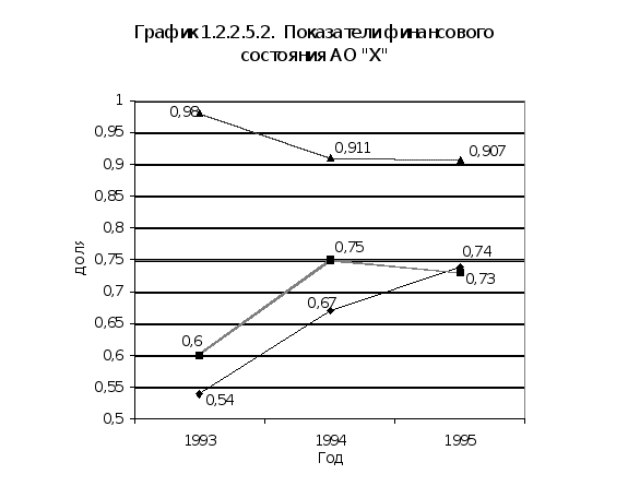 Из таблицы 1.2.2.5.4. можно сделать следующий вывод. За 1996 г. все полученные коэффициенты платежеспособности находятся на критическом уровне. Значение коэффициента восстановления платежеспособности указывает на отсутствие реальной возможности у АО “Х“ восстановить ее в ближайшее время. В 1996 г. введен показатель чистых активов, с целью оценки ликвидности организаций различных организационно-правовых форм, который сопоставляется с величиной уставного и добавочного капиталов. В данном случае, величина чистых активов превышала сумму уставного и добавочного капиталов как в 1995 г., так и в 1996 г., причем этот разрыв увеличился (на 15 748 096 тыс. руб.), что свидетельствует об улучшении платежеспособности АО “АО "Х"“. Таким образом, АО “Х“ можно признать неплатежеспособным и не имеющим возможности ее восстановить в ближайшее время. ОБЩИЙ ВЫВОД ПО АНАЛИЗУ ФИНАНСОВОГО СОСТОЯНИЯ. Общая стоимость имущества предприятия выросла за 1996 г. на 20 355 690 тыс. руб. или 5,7 %. Структура актива предприятия улучшилась как с финансовой, так и с производственной точек зрения. Изменение структуры пассива баланса свидетельствует об ухудшении платежеспособности предприятия. Положительным моментом является ослабление зависимости АО “Х“ от внешних источников финансирования и улучшения использования оборотных средств предприятия. Однако отсутствие на протяжении всего анализируемого периода у предприятия собственных оборотных средств свидетельствует о его финансовой неустойчивости. За 1994-1996 г.г. все полученные показатели платежеспособности находятся на критическом уровне. Значение коэффициента восстановления платежеспособности указывает на отсутствие реальной возможности у АО “Х“ восстановить ее в ближайшее время. Таким образом, за отчетный период финансовое состояние АО “Х“ улучшилось относительно уровня 1995 г., но остается на неудовлетворительном уровне. Также высок риск неплатежеспособности.