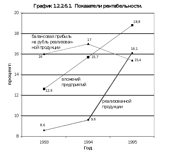 Из данных таблицы 1.2.2.6.1. следует, что балансовая прибыль выросла по сравнению с 1995 г. в 3,7 раза. Этому способствовало увеличение прибыли от реализации продукции в 3,7 раза. Однако, снижение доходов от внереализационных операций (на 80,2 %) и увеличение расходов по ним в 6,9 раз сократили прибыль на сумму 12 779 902 тыс. руб. Прибыль от прочей реализации получена, главным образом, за счет прибыли от реализации ТНП и материалов, прибыли от торговли магазина. Проведем анализ рентабельности. Для этого рассмотрим таблицу 1.2.2.6.2. Таблица 1.2.2.6.2. Показатели рентабельности.