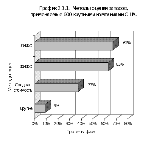Суть метода ЛИФО заключается в том, что материальные запасы оцениваются по ценам рыночных покупок, а себестоимость реализованной продукции включает в себя стоимость последних приобретений. Безусловно, подобное допущение не сочетается с действительным движением товаров на многих предприятиях. Тем не менее существует весомый аргумент в пользу данного метода, ибо в любом случае для функционирующего предприятия необходимо определенное количество материальных запасов. Когда материальные запасы реализованы, они должны быть восполнены. Сторонники метода ЛИФО считают, что наиболее точное определение прибыли, возможно лишь при условии соотнесения текущей себестоимости товаров с текущей продажной ценой, не взирая на то, какие именно товары фактически проданы. При движении цен как вверх, так и вниз метод ЛИФО предполагает, что себестоимость реализованной продукции отразит издержки в соответствии с уровнем цен на момент продажи. В результате метод ЛИФО показывает меньшую чистую прибыль в период проявления инфляционных процессов и соответственно большую чистую прибыль в период дефляционных процессов, чем любой другой метод. Таким образом, сглаживается влияние цикла экономического развития (подъемов и спадов). Важным фактором при этом является то, что при оценке материальных запасов информация о движении себестоимости и соответствующее определение прибыли приобретает более важную роль, чем определение физического движения товаров и оценка баланса. Конечно, и в отношении метода ЛИФО можно сделать критические замечания. По той причине, что в балансе материальные запасы оценены и отражены по ценам первых покупок (предшествующим ценам), эта оценка часто не совпадает с реальной стоимостью материальных запасов. Таким образом, такие балансовые показатели, как собственные оборотные средства и коэффициент покрытия, должны анализироваться с учетом всего сказанного выше. ВЛИЯНИЕ ОЦЕНКИ МАТЕРИАЛЬНЫХ ЗАПАСОВ НА ФИНАНСОВУЮ ОТЧЕТНОСТЬ. У каждого метода есть свои преимущества и недостатки, и ни один не может рассматриваться как самый лучший и совершенный. Выбор метода оценки зависит от его влияния на баланс. Отчет о финансовых результатах и их использовании, налога на прибыль и решений, принимаемых руководством предприятия. Основная проблема при выборе метода оценки запасов в там, что материальные запасы отражаются как в балансе, так и в отчете о финансовых результатах и их использовании. Как мы видели, метод ЛИФО - наиболее подходящий для отчета о финансовых результатах и их использовании, потому что наилучшим образом сопоставляет доходы от реализации продукции с их себестоимостью. Но он не является лучшим методом оценки текущей балансовой стоимости запасов особенно, когда существует длительная тенденция повышения или понижения цен. С другой стороны, метод ФИФО - наиболее подходящий при составлении баланса, потому что себестоимость запасов на конец отчетного периода является наиболее близкой к текущим ценам и, таким образом, дает более реальную картину активов предприятия. Методы ФИФО, ЛИФО и средней стоимости широко используются крупными зарубежными компаниями, как это можно увидеть на графике 2.3.1.
