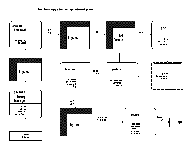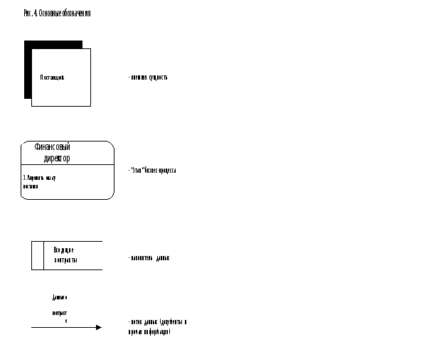 Описание организационной структуры предприятия. Составление структурно-функциональной схемы предприятия. Выяснение структурно-функциональной схемы предприятия производится в ходе проведения опроса должностных лиц предприятия, прежде всего, руководства предприятия В общем случае, для согласования с Заказчиком представляются три схемы: - структурная схема предприятия; - структурно-функциональная схема предприятия с обозначением основных потоков информации - схема удаленных объектов. В ходе уточнения и согласования реестра документов в схемы вносятся соответствующие изменения. 1. Структурная схема предприятия. На структурной схеме должна быть отражена иерархическая структура обследуемого предприятия. 2. Структурно-функциональная схема предприятия с обозначением основных потоков информации. Данная схема должна содержать: - наименование структурных подразделений; - передаваемые и получаемые документы (потоки информации между подразделениями); - все документы, указанные на схеме, должны быть пронумерованы в соответствие с реестром документов. 3. Схема удаленных объектов предприятия. Данная схема составляется только для предприятий, имеющих удаленные подразделения (склады, офисы, торговые залы и т. д.). На схеме должны быть отражены: - названия и краткие адреса удаленных объектов предприятия; - основные подразделения, расположенные на объектах; - передаваемые и получаемые документы; - наличие технических средств на объектах (серверы, локальные станции, модемы и т. д.). В пояснениях к схеме удаленных объектов указываются все информационные потоки между данными объектами. В пояснениях к данным схемам указываются функциональные обязанности подразделений и количество рабочих мест в них. Для чего нужны функциональные схемы? Данные схемы необходимы для определения количества рабочих мест в сетевой версии, определение комплектации системы (удаленный доступ, товарные отчеты), составления реестра документов, определения прав доступа, а также служат основой для создания схем бизнес-процессов. 1.1.1.2. Описание бизнес-процессов и принципов взаимодействия между подразделениями. Выяснение бизнес-процессов предприятия производится в ходе проведения опроса должностных лиц предприятия). На основании проведенных бесед составляются схемы процессов с использованием обозначений Гейна-Сарсона. Схемы бизнес-процессов необходимо формировать по однородным группам хозяйственных процессов, связанных с движением товаров (услуг), документов, отчетов и т. д. Например, движение товаров можно разбить на следующие группы: - Приобретение товара и прочее связанное с ним движение товара - Продажа и прочее связанное с ней движение товара - Перемещение товара, не связанное с приобретением или продажей На схемах используются следующие обозначения: внешняя сущность - другая организация, с которой взаимодействуют подразделения заказчика (поставщик, покупатель, банк); Система БУ и др. Накопитель - любое хранилище информации. Процесс - совокупность действий сотрудника организации заказчика при выполнении процедур, связанных с выпиской документа, отработкой документа в бухучете, формирование отчета и т. д. (см. рис.4). Указывается сотрудник и(или) подразделение, выполняющее данный процесс, и содержание действия. Шаги связываются между собой стрелками 
