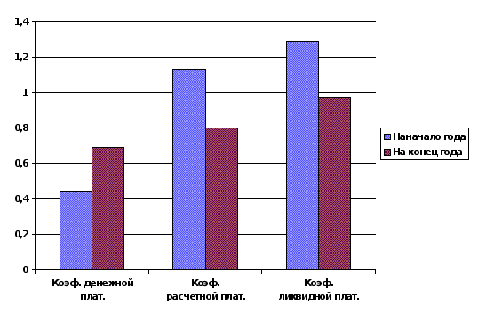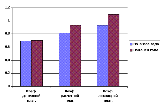 На начало года: 49528 млн.крб. / 17938 млн.крб. = 2,76 дня на конец года: 524629 млн.крб. / 122242 млн.крб. = 4,29 дня Анализ платежеспособности предприятия В экономической литературе определяют три уровня платежеспособности предприятия, которые оценивают соответственно с помощью трех коэффициентов: денежной, расчетной и ликвидной платежеспособности. Наиболее обобщающим показателем платежеспособности предприятия является коэффициент ликвидной платежеспособности, в числителе которого отражаются все оборотные средства, а в знаменателе - заемные и собственные источники их формирования. Значение коэффициента ликвидной платежеспособности меньше 1 свидетельствует о том, что предприятие имеет задолженность, превышающую уровень его оборотных средств. Иначе говоря, оно является банкротом и может быть ликвидировано, а его имущество реализовано. Таким образом, все три коэффициента платежеспособности свидетельствуют о том, что платежеспособность предприятия заметно повысилась и является реально обеспеченной. Предприятие отвечает параметрам, необходимым для осуществления с ним кредитных и других финансовых взаимоотношений (табл. 3.8.). Повышение уровня платежеспособности предприятия зависит прежде всего от улучшения результатов его производственной и коммерческой деятельности. Вместе с тем надежное финансовое состояние определяется также рациональной организацией и использованием финансовых ресурсов. В связи с этим в условиях рыночной экономики важное значение имеют не только оценка активов и пассивов баланса, но и углубленный ежедневный анализ состояния и использования хозяйственных средств. Такой анализ производится по данным управленческого учета. Коэффициент денежной платежеспособности на конец периода составил 0,69, что выше по сравнению с началом этого периода на 0,25 пункта, т.е. платежеспособность увеличилась на 0,25 х 100 / 0,44 = 56,8%. Этот показатель свидетельствует о том, что на отчетную дату 69% краткосрочных платежных обязательств предприятие может погасить немедленно (рис. 3.8.). Процент платежеспособности, сложившейся на конец периода (69%), отражает высокий уровень платежеспособности предприятия, если учесть, что сроки погашения задолженности наступают не одновременно, а разнесены во времени. Об удовлетворительном уровне платежеспособности предприятия свидетельствуют также коэффициент расчетной платежеспособности, который на начало периода составлял 1,13, а на конец - 0,8, т.е. снизился на 0,33 (рис.3.8.). Это свидетельствует о том, что если на покрытие платежных обязательств мобилизовать не только денежные средства, но и средства в расчетах, готовую продукцию, товары отгруженные, дебиторскую задолженность и другие реально реализуемые активы, то на конец периода платежные средства на 80% покрывали бы платежные обязательства. Это свидетельствует о негативных изменениях финансового состояния предприятия. Наиболее обобщающим показателем платежеспособности предприятия является коэффициент ликвидной платежеспособности, в числителе которого отражаются все оборотные средства, а в знаменателе - заемные и собственные источники их формирования. Этот показатель превышал единицу и составлял на начало периода 1,29 т.е. ликвидная стоимость оборотных средств была на 0,29 выше платежных обязательств. На конец отчетного периода ликвидная плате