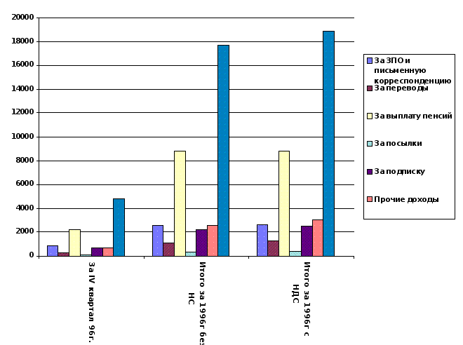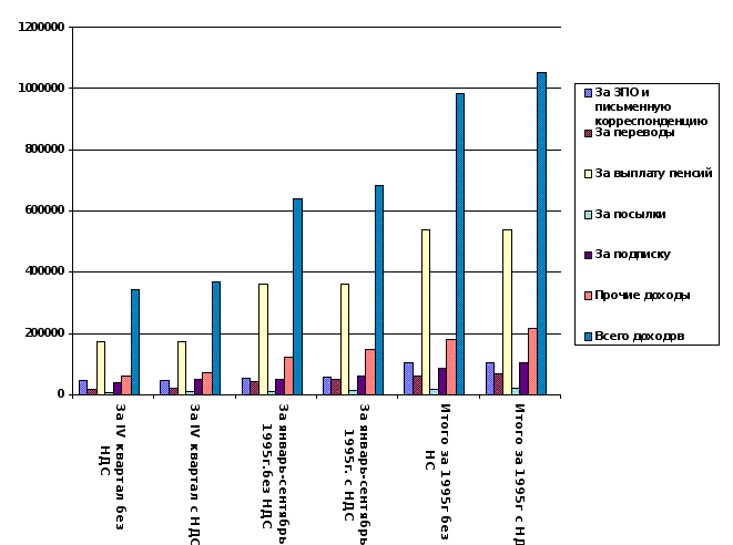 Таблица показывает, что основным видом доходов является доставка и выплата пенсий, доход от выплаты пенсий не облагается налогом на добавленную стоимость. Высокую долю занимает доход от оказания услуг КРПС “Крымтелеком” по приёму платежей от населения за пользование телефоном (рис.3.10.).