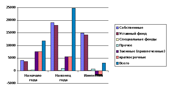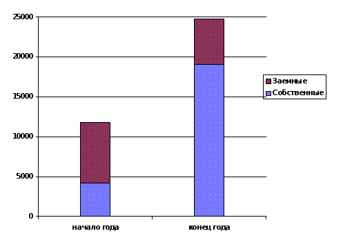 рис.3.19. Диаграмма состава и структуры пассивов на начало и конец года Используем данные о составе и структуре источников формирования средств предприятия для оценки его финансовой стабильности с помощью коэффициента соотношения собственных и заемных средств. На начало года он составил: 7606,5 тыс.грн. / 4188 тыс.грн. = 1,82; на конец года : 5677,8 тыс.грн. / 19082,8 тыс.грн. = 0,29. Это значит, что на 1 грн. собственных средств на начало отчетного периода предприятие привлекало 1грн. 82 коп. заемных средств, а на конец - 29коп. Такие показатели свидетельствуют о низком уровне использования кредитных источников формирования оборотных средств и интенсивном режиме использования собственных средств. К тому же за год увеличился коэффициент соотношения указанных источников, что позитивно повлияло на финансовое состояние предприятия. По данным баланса рассчитаем также следующие показатели: коэффициент маневренности оборотных средств Км, который характеризует степень мобильности (гибкости) использования собственных средств хозяйства. Его рассчитывают делением суммы собственных оборотных средств на сумму источников собственных средств. На начало периода составил: 225,9 тыс.грн. / 4188 тыс.грн. = 0,05 на конец года: 240,4 тыс.грн. / 19082,8 тыс.грн. = 0,01 коэффициент реальной стоимости основных средств Кр.с.о.с, показывающий, насколько эффективно используются основные средства. Его определяют как отношение остаточной стоимости основных средств к чистой стоимости имущества предприятия по балансу. На начало года: 3591,5 тыс.грн. / 11794,5 тыс.грн. = 0,3 на конец года: 17656,3 тыс.грн. / 24760,6 тыс.грн.= 0,71 За отчетный период эффективность использования основных средств существенно возросла , на 0,41.