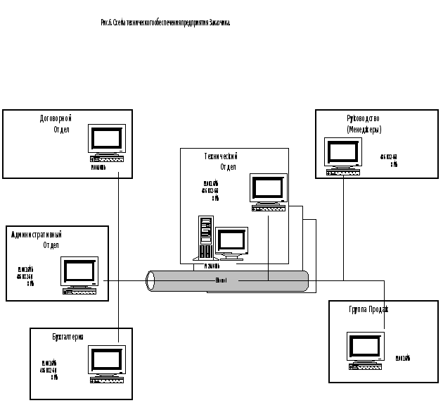 1.1.1.5. Оценка материально-технического обеспечения заказчика. При проведении предпроектного обследования необходимо выяснить наличие технических средств в подразделениях Заказчика, подлежащих автоматизации (см. Приложение 2 п. 1.3.). По результатам обследования составляется схема технического обеспечения предприятия с описанием характеристик компьютеров (процессор, ОЗУ), сети (ОС, число рабочих станций), принтеров (тип по принципу печати, сетевой или локальный) и др. обеспечения (модемы и др.). При наличии на предприятии удаленных объектов выясняется наличие телефонных линий, их количество и качество, а также наличие коммуникационного оборудования. В особо сложных случаях рекомендуется привлекать для проведения экспертизы сети, телефонных линий и т. д. специалистов Технического отдела. На основе среднего количества документов в день, комплектации системы и количества рабочих мест определяются требования и рекомендации к техническому обеспечению. Эти требования сравниваются с текущими данными по техническому обеспечению заказчика, и на основании разницы между ними выявляется потребность заказчика в техническом обеспечении. Пример Схемы Технического обеспечения предприятия Заказчика - Рис.6.