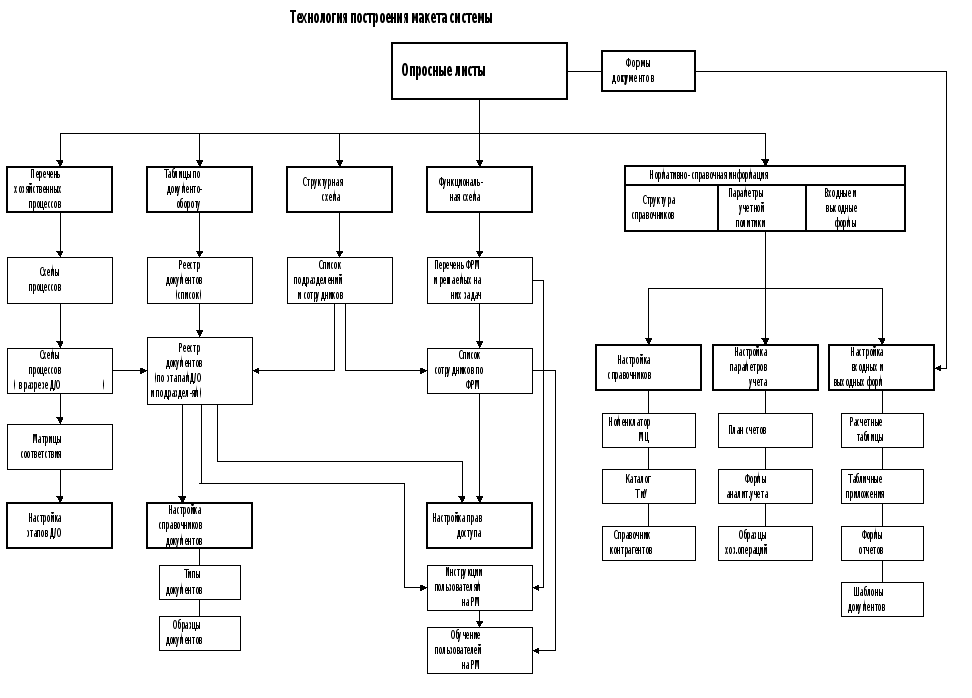 Основной частью проекта является рабочий макет Системы, который по окончании работ является, наряду с документацией, объектом демонстрации функционирования предприятия Заказчику. От правильно построенного макета зависят дальнейшие затраты на обучение персонала и внедрение Системы. Прежде чем приступить к созданию макета, Проектировщик должен представлять ВСЕ бизнес-процессы, происходящие на предприятии, иметь образцы наименований номенклатуры ТМЦ, Прайс-листы, образцы первичных документов и отчетов, список сотрудников (частичный), список поставщиков и покупателей (частичный), реквизиты предприятия. В случае необходимости (нет четкого понимания процессов, нет части документов и т.п.) Проектировщик должен проконсультироваться по телефону с представителем Заказчика, либо выехать на предприятие для полного выяснения вопроса. Общесистемные настройки в макете. Перед началом создания макета необходимо выбрать соответствующую комплектацию Системы. Далее роектировщик формирует образцы первичных документов (Платежные документы, Заказы клиентов, Входящие контракты и т. д.), словари системы: Курсы валют, Общие понятия, Принтерные последовательности. Устанавливает параметры торговых операций, параметры заработной платы (по необходимости). Настройки в макете для автоматизации документооборота. Настройка документооборота - основная работа Проектировщика над макетом. Настройка осуществляется по каждому типу документов, участвующих в хозяйственной деятельности предприятия. При настройке анализируются схемы бизнес-процессов. Выявляется логическая последовательность выполнения этапов документооборота. Настройка осуществляется в словаре “Общие понятия”. Для первоначального освоения осуществления настроек в Системе рекомендуется следующая методика. Переход от схем документооборота к настройкам этапов в программе После описания основных циклов финансово-хозяйственной деятельности в виде схем этапов документооборота необходимо получить исходные данные для настройки программы. Для этого для каждого из документов, используемых в программе, строится ГРАФ, вершинами которого являются этапы документооборота, связанные между собой стрелками, отражающими последовательность действий (выполнения этапов). Если с каким-либо документом связаны несколько схем этапов документооборота (например, по исходящему счету может осуществляться продажа товара за наличные или по безналичному расчету, в офисе или на выезде), то при построении ГРАФА связи между этапами документооборота переносятся на ГРАФ последовательно, методом добавления новых этапов и связей между ними. ГРАФ анализируется и видоизменяется таким образом, чтобы каждому рассматриваемому этапу документооборота предшествовал только один этап (Предшествующих этапов может быть два или больше, но все они обязательно должны быть выполнены к моменту выполнения текущего этапа). Очевидно, что при этом необходимо несколько видоизменять саму схему документооборота на предприятии. Если же возникает ситуация, когда условием выполнения текущего этапа могут быть два выполняющихся порознь предшествующих этапа (т. е. к моменту выполнения текущего этапа один из предшествующих ему не выполнен) и изменение системы документооборота нежелательно или невозможно, то такая ситу