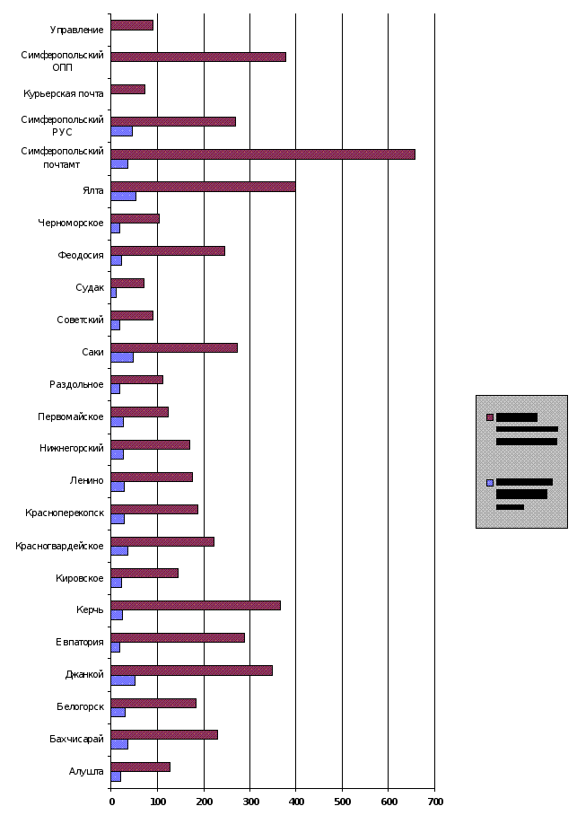 Работы этого этапа проводятся либо по заявке Заказчика, либо в виде ежемесячного абонементного обслуживания в течении года. Стоимость сопровождения определяется необходимым для предприятия Заказчика уровнем сервиса и зависит от количества пользователей системы. В результате проведения всех четырех указанных выше этапов работ Заказчик получает устойчиво функционирующую систему управления предприятием, адекватную его нынешнему бизнесу и способную развивать его дальше. После подписания Договора на предпроектное обследование, для обеспечения результативного и качественного проведения работ, необходимо Приказом по предприятию оповестить должностных лиц и рядовых сотрудников подразделений о начале работ. Менеджер Проекта предлагает руководству Заказчику проект Приказа и согласовывает содержание Приказа, сроки и состав персонала. Перед началом работ необходимо также Приказом назначить администратора Системы на предприятии Заказчика. Требования о Приказах необходимо оговорить в Договоре на проектные работы, там же необходимо согласовать условие о предоставлении копий Приказов Менеджеру Проекта перед началом выполнения проектных работ. Глава 2. Организационно экономическая характеристика КРППС “Крымпочта” Основные положения Крымское республиканское предприятие почтовой связи “Крымпочта”, основано на государственной собственности, входит в состав Украинского объединения почтовой связи “Укрпочта” и подчиняется Министерству связи Украины. Цель и предмет деятельности 1. Предприятие создано с целью своевременного, качественного и полного удовлетворения потребностей всех форм собственности, как юридических, так и физических лиц услугами почтовой связи на территории Автономной Республики Крым в соответствии с действующим законодательством Украины и лицензиями.