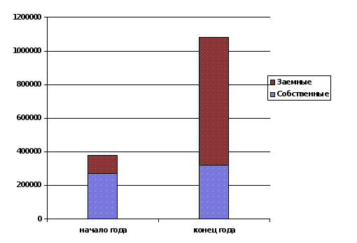 рис.3.6. Диаграмма состава и структуры пассивов на начало и конец года Используем данные о составе и структуре источников формирования средств предприятия для оценки его финансовой стабильности с помощью коэффициента соотношения собственных и заемных средств. На начало года он составил: 111456 млн.крб. / 268139 млн.крб. = 0,41; на конец года : 760655 млн.крб. / 322270 млн.крб. = 2,36. Это значит, что на 1 крб. собственных средств на начало отчетного периода предприятие привлекало 41 коп. заемных средств, а на конец - 2крб. 36коп. Такие показатели свидетельствуют о высоком уровне использования кредитных источников формирования оборотных средств и интенсивном режиме использования собственных средств. К тому же за год увеличился коэффициент соотношения указанных источников, что позитивно повлияло на финансовое состояние предприятия. По данным баланса рассчитаем также следующие показатели: коэффициент маневренности оборотных средств Км, который характеризует степень мобильности (гибкости) использования собственных средств хозяйства. Его рассчитывают делением суммы собственных оборотных средств на сумму источников собственных средств. На начало периода составил: 20787 млн.крб. / 268139 млн.крб. = 0,08 на конец года: 22587 млн.крб. / 322270 млн.крб. = 0,07 коэффициент реальной стоимости основных средств Кр.с.о.с, показывающий, насколько эффективно используются основные средства. Его определяют как отношение остаточной стоимости основных средств к чистой стоимости имущества предприятия по балансу. На начало года: 231248 млн.крб. / 379595 млн.крб. = 0,61 на конец года: 262623 млн.крб. / 1082925 млн.крб.= 0,24 За отчетный период эффективность использования основных средств существенно снизилась, на 0,37.