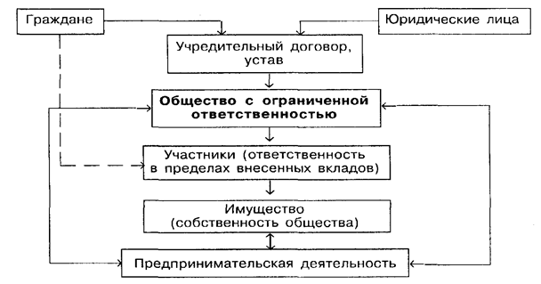 Одной из наиболее распространенных организационно-правовых форм коммерческих организаций являются общества с ограниченной ответственностью. Это объединения юридических и физических лиц для совместной предпринимательской деятельности. Имущество общества с ограниченной ответственностью состоит из вкладов участников,,полученных доходов и других законных источников. Если участниками общества являются юридические лица, они сохраняют права юридического лица и полную самостоятельность. Уставный капитал общества подлежит регистрации в финансовых органах. Организационная схема общества с ограниченной ответственностью