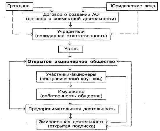 Наиболее сложной организационно-правовой формой коммерческих организаций являются акционерные общества открытого и закрытого типов. Как правило, акционерное общество (АО) объединяет широкий круг юридических и физических лиц. Имущество акционерного общества формируется за счет продажи акций в форме открытой либо закрытой подписки, полученных доходов и иных источников. Уставный капитал акционерных обществ формируется за счет взносов, оформленных в виде определенного количества акций равной номинальной стоимости, АО выпускают обыкновенные и привилегированные (не более 25% уставного капитала) акции, имеющие разную номинальную стоимость и дающие их держателям разные права. Различия между открытыми и закрытыми акционерными обществами касаются главным образом выпуска и обращения акций . Открытое акционерное общество имеет потенциально неограниченные возможности в привлечении капитала, увеличении числа акционеров, количестве и сумме эмиссии, осуществляемых в форме открытой подписки. Закрытая подписка имеет место при учреждении акционерного общества, в дальнейшем проводятся открытые подписки. Организационная схема открытого акционерного общества