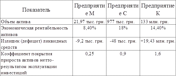 Покажемо, як отримані ці цифри, користуючи даними підприємства С, а потім дамо коментар до таблице1. Новий обсяг активу отриманий на основі однієї з модифікацій широко застосовуваного у фінансовому плануванні і прогнозуванні методу: при незмінній структурі пасиву (а ми використовували саме таке допущення) темпи приросту обороту застосовні до темпів приросту обсягу балансу. Таким чином, обсяг активу підприємства С, збільшуючись на 25% у рік, зростає за трьох року з 500 тис. грн. до 977 тис. грн2. Рівень економічної рентабельності активів отриманий перемножуванням комерційного моржу і коефіцієнта трансформації: 12% ( 1,5 = 18%. Для одержання суми дефіциту (надлишку) ліквідності необхідно спочатку обчислити сумарний НРЭИ за трьох року, а потім порівняти з ним суму приросту обсягу активу. Для розрахунку НРЭИ використана формула комерційного моржу (КМ): КМ = НРЭИ : ОБОРОТ ( 100 ( НРЭИ = ОБОРОТ ( КМ : 100. Таким чином, НРЭИ першого року складає 112,5 тис. грн., другого року 140,6 тис. грн., третього року - 175,8 тис. грн. У сумі це 429 тис. грн. Далі: (977 тис. грн. - 500 тис. грн.) - 429 тис. грн. = 48 тис. грн. Коефіцієнт покриття приросту активів нетто результатом експлуатації інвестицій складає (429 тис. грн. : 477 тис. грн.) = 0,9. Подані в таблиці дані свідчать про те, що: · Підприємство М з найбільше бурхливими темпами приросту обороту протиставляє подвоєнню обсягу активів підвищену (завдяки високій швидкості оборотності засобів) економічну рентабельність активів. Але, не дивлячись на це, лише 25% приросту активів фінансуються за рахунок внутрішніх джерел. Дефіцит ліквідності на покриття потреб росту підприємства складає 75% потрібного приросту активу; · Підприємство С протиставляє подвоєнню обсягу активів підтримка високої рентабельності (притім, що обидва її елементи - і комерційний марж, і коефіцієнт трансформації - мають дуже пристойні значення). Проте і цьому підприємству не вдасться досягти повного покриття необхідного приросту активів. Дефіцит складає 10%; · Підприємство К з найменшими темпами приросту обороту, але з найбільше широким масштабом діяльності збільшує свої активи лише на одна третина і має більш скромний рівень рентабельності, чим підприємство С. Доки буде можливим підтримка 14,4%-ной рентабельності без серйозних структурних змін - це, звичайно, дуже складне питання. Але поки що підприємство утримує свої позиції, маючи надлишок ліквідності в 19,43 млн. грн., що із лихвою дозволяє покрити приріст активів. Приклад 2. Візьмемо підприємство ДО із приклада 1 і з рівним вже отриманий нами раніше коефіцієнт покриття приросту активів нетто результатом експлуатації інвестицій 1,6 із цим же коефіцієнтом, але розрахованим для 25%-ных темпів приросту обороту[13] . Найпростіші обчислення виявляють дефіцит ліквідності в сумі 26,7 млн. грн. замість старого надлишку в 19,43 млн. грн., а шуканий коефіцієнт знижується з 1,6 до 0,71 (комерційний марж - як і раніше 9%). Занадто швидкі для даного підприємства темпи росту обороту породили дефіцит ліквідних засобів замість їхнього надлишку. Якщо підприємство не збирається знижувати темпи нарощування обороту, то воно повинно зробити серйозні зміни своєї фінансової структури[14] . Ідея інтеУкраїниеренції (накладення) довгострокових і короткострокових цілей, феноменів і результатів діяльності підприємства підказуються самою логікою економічного процес