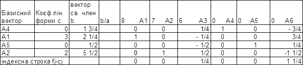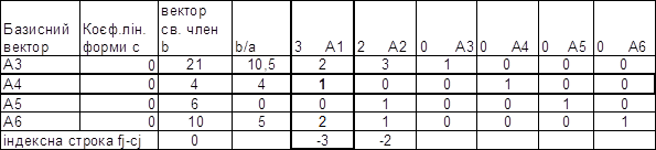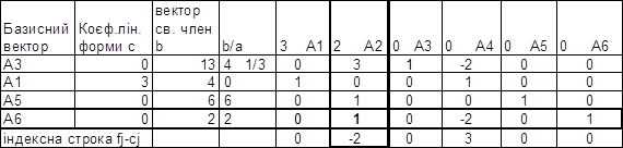Рішення: х1 = 0, х2 = 0, х3 = 21, х4 = 4, х5 = 6, х6 = 10 f = 0 Тому що в індексному рядку є негативні елементи - рішення не є оптимальним. А1 вводимо в базис замість вектора А4 Рішення: х1 = 4, х2 = 0, х3 = 13, х4 = 0, х5 = 6, х6 = 2 f = 12 Тому що в індексному рядку є негативні елементи - рішення не є оптимальним. А2 вводимо в базис замість вектора А6