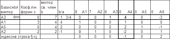 Рішення х1 = 4, х2 = 2, х3 = 7, х4 = 0, х5 = 4, х6 = 0 f = 12 Тому що в індексному рядку є негативні елементи - рішення не є оптимальним. А4 вводимо в базис замість вектора А3