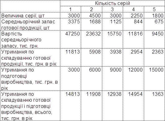 Як очевидно з таблиці, оптимальне річне число закупівель у даному прикладі дорівнює чотирьом, оскільки сума витрат по складуванню й обслуговуванню закупівель у цьому випадку є найменшої. Ті ж правила діють і при визначенні оптимального розміру серії що запускається продукції. При виробництві продукції значним числом дрібних серій витрати по складуванню готової продукції будуть мінімальними. Проте зростуть витрати на підготування виробництва. Розрахуємо оптимальний розмір серії запуску (таблиця 9)2. З таблиці випливає, що найбільше оптимальним розміром серії запуску є серія 2 по 4500 штук, у результаті котрої витрати по складуванню готової продукції і підготуванню виробництва складають мінімальний розмір - 11908 тис. грн. у рік. Звичайно, подібні розрахунки не можна вважати достатньо об'єктивними і точними, проте, у визначеному наближенні їх прийняти можна. У сполученні з традиційними шляхами зниження витрат на виробництво продукції знову виниклі чинники дозволять у комплексі довести розмір витрат виробництва до оптимального рівня. Проблема беззбиткового функціонування, розширеного відтворення, з одного боку, збитковості і банкрутства - з інший, багатьох вітчизняних компаній, банків, підприємств різноманітних галузей господарства і сфер діяльності є як не можна більш актуальної. Тільки зростання прибутку, нововведення забезпечують фінансову основу самофінансування ринкової діяльності фірми, здійснення її розширеного відтворення. Таблиця 9.