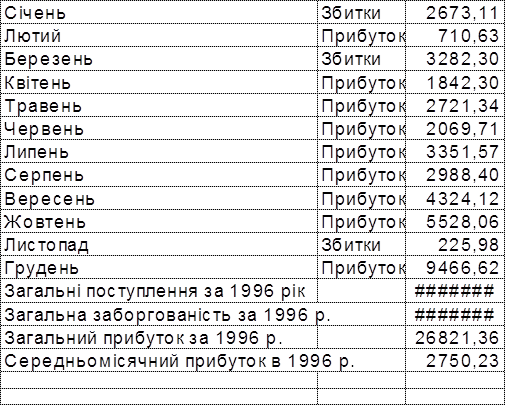 Загальні щомісячні постійні витрати ...…………9950 Приблизні щомісячні перемінні витрати ...……......50 Разом ...…………………………………………………10200 Для беззбиткової роботи необхідно щомісяця продавати: 64 штуки IBM P133 або 158,18 (прибуток) 29 штук портативних IBM P133 або 348,00 (прибуток) 18 штук IBM Server 557,00 (прибуток) 15 штук систем IBM, 15 принтерів, 11 235,00 (прибуток) комп'ютерів P133, один комп'ютер IBM Server, 2 портативних P133 Як очевидно, сюди входять тільки продажі самих комп'ютерів. Природно, що існує маса комбінацій комп'ютерів, програмного забезпечення і послуг, що дозволять ВАТ «Орбіта» забезпечувати беззбитковість кожний місяць. Вищезгадана апаратура проект, що показує, що варто продавати, щоб домогтися беззбитковості, проте фірма ринеться до більшого. Перший новий магазин мережі планувалося відчинити протягом першого року після переїзду ВАТ «Орбіта». Тепер роздивимося планові і фактичні показники (табл. 3, 4, 5) сформовані в 1996-1998 р.м. Таблиця 3. Баланс прибутку і збитків на 1996 рік1.