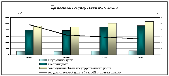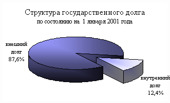 Государственный долг Российской Федерации на 1 января 2001 года составил 4479,7 млрд. рублей (63,4% к объему ВВП), в том числе внутренний долг – 557,4 млрд. руб. (7,9% к ВВП) и внешний долг – 144,5 млрд. долл. США (3922,3 млрд. руб., или 55,5% к ВВП). [25] Высокий уровень внешней задолженности в структуре государственного долга в значительной степени обусловлен падением долларовой стоимости российского валового внутреннего продукта в результате резкого обесценивания рубля по отношению к иностранным валютам осенью 1998 года. В среднесрочном периоде предполагаемая динамика государственного долга по отношению к ВВП имеет понижающуюся направленность, что связано, прежде всего, с ограничительной политикой заимствований в целях рефинансирования государственного долга в условиях относительно благоприятной внешнеэкономической конъюнктуры. Согласно прогнозу, к началу 2003 года совокупный размер государственного долга составит порядка 50% ВВП, что почти вдвое ниже уровня начала 2000 года.