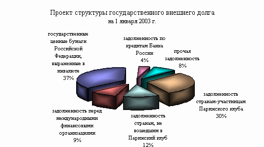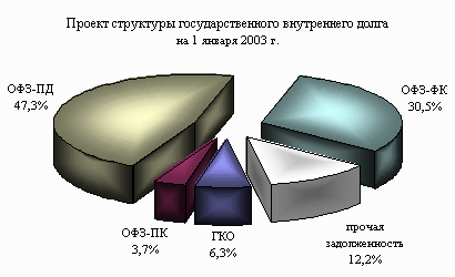 В структуре внутреннего государственного долга основную долю (81,5%) занимают обязательства, оформленные облигациями федерального займа. Основной прирост правительственных обязательств предусмотрен в секторе облигаций федеральных займов с фиксированным купонным доходом – 39,5 млрд. рублей. Объем государственного долга, оформленного краткосрочными облигациями, увеличится за 2002 год на 5,2 млрд. рублей. Заметно возрастут в 2002 году государственные гарантийные обязательства - с 0,8 до 6,6 млрд. рублей. [25] Проектом федерального закона "О федеральном бюджете на 2002 год" учтены расходы на компенсацию выплат владельцам вкладов, предусмотренную федеральным законом “О восстановлении и защите сбережений граждан Российской Федерации”. В то же время общая сумма указанной задолженности в структуре государственного внутреннего долга отсутствует. В связи с изложенным, объем и структура государственного внутреннего долга не является достоверной и требует уточнения.