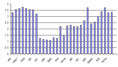 Несмотря на увеличение доходов российского бюджета в % от ВВП, в долларовом выражении они только сейчас выходят на докризисный уровень. Таким образом, если объемы выплат по внешним долгам в 1998 и 1999 гг. в номинальном выражении почти не отличались, то их доля в бюджетных доходах составила 31 и 45%. Кроме того, увеличение бюджетных доходов происходит на фоне исключительно благоприятной конъюнктуры, и ее ухудшение в дальнейшем может привести к снижению платежеспоспобности правительства (см.график)