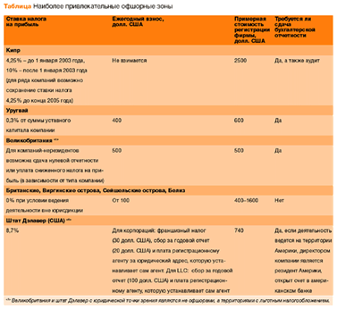 Реферат: Как работать с офшорамиРеферат: Как работать с офшорамиНетёсова Анна (эксперт журнала «Финансовый директор») Офшорные компании можно использовать для налогового планирования, сохранения конфиденциальности о владельце бизнеса и защиты своих финансовых владений. Однако работа с такими компаниями требует тщательной подготовки и особой осторожности. При выборе офшорной зоны необходимо учитывать, какие задачи планируется решать с помощью офшора: неправильный выбор юрисдикции, в которой открывается офшорная компания, может свести к нулю все ее преимущества. Для чего нужны офшорные компании В мировой практике офшорные фирмы используются в самых разнообразных схемах. Можно выделить три наиболее распространенные цели, ради которых создаются и регистрируются офшорные фирмы. Оптимизация налогообложения Наиболее часто офшорные фирмы создаются для оптимизации налоговой нагрузки. Причем если минимизация налогов с помощью открытия фирм-однодневок является нарушением закона, то использование офшорных фирм позволяет компаниям снижать налоговое бремя на абсолютно законных основаниях. Например, российский предприниматель открывает офшорную фирму, а затем вместе с ней создает совместное предприятие. В качестве вклада в уставный капитал офшорная фирма ввозит в Россию оборудование, которое по российскому законодательству не облагается НДС и освобождается от таможенных пошлин1, а также в отношении которого применяются налоговые льготы на территории офшорной юрисдикции. Оптимизацией налоговых платежей с помощью офшоров занимаются не только российские фирмы, но и многие известные западные компании, такие как BMW или General Motors. В настоящее время компании Stanley Works и PricewaterhouseCoopers, чтобы не платить высокие налоги в США, собираются перевести свои центральные офисы на Багамские острова2. Часто для налогового планирования используется так называемое "трансфертное ценообразование" (transfer pricing) с участием офшорных фирм. В этом случае основная производственная компания базируется в стране с высоким уровнем налогообложения и продает свою продукцию по заниженной цене офшорной фирме, которая перепродает ее конечным покупателям по реальной цене. Таким образом, вся прибыль аккумулируется в офшорной зоне и облагается налогом по минимальной ставке. Историческая справка История использования предпринимателями территорий с льготным налогообложением берет свое начало много веков назад в Древней Греции. Когда в Афинах был введен двухпроцентный налог на экспорт и импорт, греческие и финикийские купцы начали продавать свои товары на соседних островах, где не было никаких налогов. Аналогичные примеры есть и в истории Средневековья. Так, в Европе XV века английские купцы предпочитали продавать шерсть не у себя на родине, где налоги были достаточно высоки, а во Фландрии, где их практически не было. Американские колонисты в XVIII веке, чтобы избежать импортного налога, установленного Англией для своих североамериканских колоний, минимизировали налогообложение, направляя свои торговые потоки через Латинскую Америку. Термин "офшор" (от англ. off shore - вне берега) впервые был использован в одной из американских газет в конце 50-х годов XX века для обозначения финансовой организации, избежавшей государственного контроля путем перемещения деятель