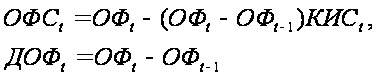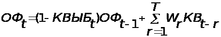 (2.7) где ОФ, ОФС – балансовая и среднегодовая стоимость основных фондов; ДОФ – прирост основных фондов, КИС - коэффициент использования введенных основных фондов в течение года. Зависимость основных фондов от капитальных вложений (формула распределенного лага) и выбытия основных фондов моделируется следующим образом :