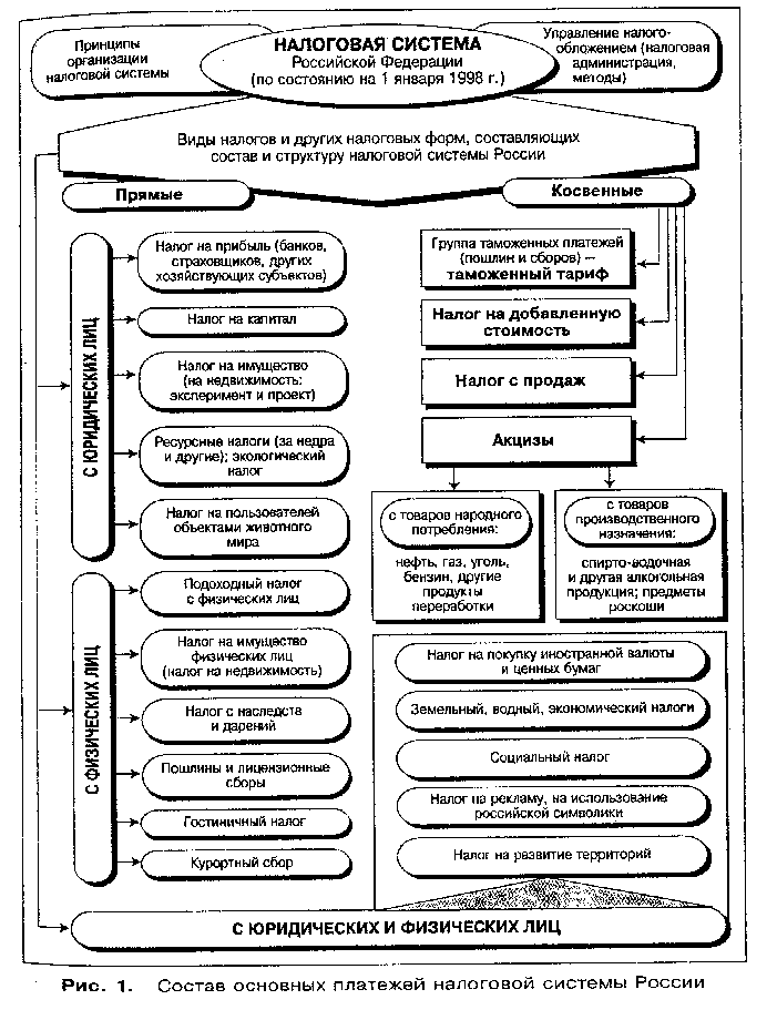 Основная функция налогов в обществе – фискальная, касающаяся интересов государственной казны (От лат. fiscus – государственная казна). Государство, устанавливая налоги, стремится прежде всего обеспечить себе необходимую материальную базу для осуществления своих функций и возложенных задач. В период становления новоевропейского буржуазного государства эта направленность налогов признавалась единственной. Однако ближе к концу ХIX в. в эпоху больших социальных потрясений формируется новая тенденция теории налогов, рассматривающая их как социальный регулятор, орудие социальных реформ, направленных на постепенное выраввнивание уровня доходов населения. Во второй половине тридцатых годов ХХ века появляется концепция использования налогов в качестве средства регулирования экономики и обеспечения стабильного экономического роста. С середины ХX в. регулирующая функция налогов получает всеобщее признание и широкое применение. Мировой опыт свидетельствует, что функции налогов находятся в постоянном развитии и эволюционируют вместе с развитием государства. Питая бюджет, налоги являются одним из основных источников финансирования всех направлений деятельности государства и экономическим инструментом реализации государственных приоритетов. Две основные функции налогов – фискальная и регулирующая – взаимосвязаны и взаимозависимы, но вторая не может развиваться в ущерб первой. Совокупность налогов, сборов, пошлин и других обязательных платежей в бюджеты разных уровней и государственные внебюджетные фонды, установленных на принципах и в порядке, определенных федеральными законами РФ, и взимаемых на территории РФ, составляет налоговую систему Российской Федерации. В настояшее время основу налоговой системы РФ составляют такие налоги, как налог на прибыль с юридических лиц, подоходный с граждан, и два косвенных налога – на добавленную стоимость и акцизы. Общая схема налоговой системы РФ по состоянию на 1 января 1998 г приведена на рис. 118.