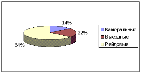 Примечание. Источник: собственная разработка [64; 65]. среди плательщиков в 2002 году. В то же время отмечается снижение процента взыскания в целом с 76,0% до 66,1% на фоне роста его по государственному сектору и снижения по негосударственному сектору. Таким образом, проблема взыскания допричисленных сумм становится еще более актуальной. Что касается ситуации с доначисленными платежами, то отмечается весьма внушительный рост в 2002 году доли доначислений, приходящихся на одного субъекта хозяйствования. Естественно, при учете темпов инфляции такой рост оказывается меньше, но он имеется, что свидетельствует в пользу некоторого повышения эффективности налоговых проверок в 2002 году. За нарушение налогового законодательства составлено 473 протокола об административной ответственности, по которым привлечено к ответственности 220 граждан (что на 31 человек больше, чем в 2001 году). Из общего числа составленных протоколов 249 по юридическим лицам, по которым привлечено к ответственности 127 человек [61, с. 2]. По данным отчетности, в 2002 году было проведено 1499 налоговых проверок, из которых 155 камеральных, 356 выездных и 988 рейдовых [69]. Вообще, в анализируемом периоде наиболее эффективными оказались именно рейдовые мероприятия: по их итогам работниками отдела контроля за налогообложением физических лиц доначислено в бюджет 9071,9 тыс. руб. Основные доначисления пришлись на предпринимателей, уплачивающих единый налог. На рис. 1 показано долевое соотношение видов проверок, проведенных инспекцией в 2002 году.