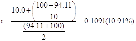 дисконтом (ниже номинала), т.к. Предположим далее, что ставка банковского процента снизилась с 11 % до 9,5 %. Номинальная стоимость облигации и размер ежегодных выплат при этом сохраняется неизменным. Тогда рыночная цена облигации составит: