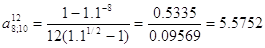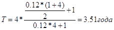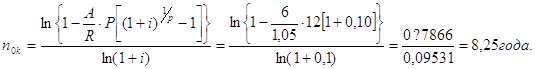Аналогичным путем можно найти срок окупаемости для других видов распределения отдачи. В каждом таком случае капиталовложении приравниваются к современной величине финансовых рент, т.е. IC = А, а члены денежного потока Pk = R - члену ренты, число членов потока в году - Р. Пример 3.9. Инвестиции к началу поступления доходов составили 6 млн.у.д.е., годовой доход ожидается на уровне 1,05 млн.у.д.е., поступлении ежемесячные при принятой ставке сравнения i = 10 %. Исходя из формулы для расчета срока постоянных рент, постнумерандо