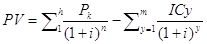 Ставка сравнения (норматив рентабельности) принята в размере 10 %. NPVА = (-200) * 1.1-1 + (-300) * 1.1-2 + (100) * 1,1-3 + (300) * 1.1-4 + (400) * 1.1-5 + 400* 1,1-6 + 350 * 1,1-7= -429,75 + 933,8 = 504,05 тыс..у.д.е. NPVА = (-400) * 1.1-1 + (-100) * 1.1-2 + (100) * 1,1-3 + (200) * 1.1-4 + (200) * 1.1-5 + 400* 1,1-6 + 400 * 1,1-7+ 350 * 1,1-8= -446,28 + 930,97 = 483,97 тыс..у.д.е. В рассматриваемых примерах капиталовложения (инвестиции) и отдача от них были представлены потоками платежей, в которых отсутствовала закономерность изменений во времени. Возвратимся теперь к рассмотрению случаев, когда инвестиции и отдача от них являются потоками платежей, представляющих определенные, изменяющиеся во времени закономерности. В этих случаях расчет можно произвести, используя формулы приведенных величин рент. Если вложения и поступления равномерные и дискретные, причем доходы начинают постапать сразу же после завершения вложений, то величина NPV находится как разность современных величин двух рент. NPV = Pk * an2/i Vhi - ICfn1/i (3.3) где Рк_ - доходы в периоды I, 2, ... n2; С I - инвестиционные расходы в периоде 1, 2,…n1; Vh1- коэффициент дисконтирования по ставке приведения -i ; n1- продолжительность периода инвестиций; n2- продолжительность получения отдачи (дохода) от инвестиций. Пример 3.6. Инвестиции производится поквартально по 0,5 млн. у.д.е. на протяжении трех лет (n1 = 3 года; С I = 0,5 • 4 = 2,0 млн.у.д.е. в год; Р1 = 4). Доходы начинают поступать сразу же после завершения вложений. Ожидаемая отдача оценена в размере 1,3 млн.у.д.е. в год. Поступления ежемесячные в течение восьми лет, т.е. параметры второй ренты: С I = 1,3; n2 = 8; Р2 = 12. Норматив рентабельности 10 %.