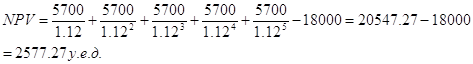 Очевидно, что NPV > 0 проект следует принять, NPV < 0- проект должен быть отвергнут, NPV= 0 - проект не прибылен, но и не убыточен. При прогнозировании доходов по годам необходимо учитывать все виды поступлений как производственного, так и непроизводственного характера, которые могут быть ассоциированы с данным проектом. Так, если по окончании периода реализации проекта планируется поступление средств в виде ликвидационной стоимости оборудования или высвобождения части оборотных средств, они должны быть учтены как доходы соответствующих периодов. Если проект предполагает не разовую инвестицию, а последовательное инвестирование финансовых ресурсов в течение нескольких лет (m -лет), то формула для расчета NPV модифицируется следующим образом: Необходимо отметить, что показатель NPV отражает прогнозную оценку изменения экономического потенциала фирмы в случае принятия рассматриваемого проекта. Этот показатель аддитивен во временном аспекте, т.е. NPV различных проектов можно суммировать. Это очень важное свойство, выделяющее этот критерий из всех остальных и позволяющее использовать его в качестве основного при анализе оптимальности инвестиционного портфеля. Рассмотрим пример с использованием данного метода для оценки проекта. Пример 3.3.Фирма рассматривает целесообразность приобретения новой технологической линии по цене 18000 у.д.е. По прогнозам сразу же после пуска линии ежегодные поступления после вычета налогов составят 5700 у.д.е. Работа линии рассчитана на пять лет. Ликвидационная стоимость линии равна затратам на ее демонтаж. Необходимая норма прибыли составляет 12 %. Следовательно, чистая текущая стоимость проекта равна по (3.I):