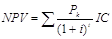 При расчете чистого потока денежных средств вычитаются дополнительные расходы на выплату федерального подоходного налога из величины ежегодной экономии денежных средств (21360 - 4260 = = 17100). Эта цифра (I7I00) сопоставляется с дополнительным доходом после выплаты налогов, который равен 6500 у.д.е. в год. Денежный поток и чистая прибыль различаются на сумму дополнительного износа (I7I00 - 10800 = 6500). Вследствие того, что стартовые расходы составляют 54000 у.д.е., мы можем заменить старое оборудование на новое, ожидая получить чистую экономию I7I00 у.д.е. ежегодно в течение 5 лет. Рассмотрев основные принципы определения денежных потоков, перейдем к методам анализа эффективности инвестиционных проектов. 3.2. Метод расчета чистого приведенного эффекта (дохода).При экономической оценке инвестиционных проектов используется ряд методов. Данный метод является одним из основных. Суть метода сводится к расчету чистой текущей стоимости – NPV (net present valui), которую можно определить следующим образом: текущая стоимость денежных притоков за вычетом текущей стоимости денежных потоков, т.е. данный метод предусматривает дисконтирование денежных потоков с целью определения эффективности инвестиций. Поскольку приток денежных средств распределен во времени, его дисконтирование производится по процентной ставке i . Важным моментом является выбор уровня процентной ставки, по которой производится дисконтирование. В экономической литературе иногда ее называют ставкой сравнения, т.к. оценка эффективности часто производится именно при сравнении вариантов капиталовложений. Иногда коэффициент дисконтирования по выбранной ставке - i называют барьерным коэффициентом. Несмотря на различие названий, эта ставка должна отражать ожидаемый усредненный уровень ссудного процента на финансовом рынке. Важным моментом при определении процентной ставки, используемой для дисконтирования, является учет риска. Риск в инвестиционном процессе, независимо от его конкретных форм, в конечном счете предстает в виде возможного уменьшения реальной отдачи от вложенного капитала по сравнению с ожидаемой. Так как это уменьшение проявляется во времени, то в качестве общей рекомендации по учету возможных потерь от сокращения отдачи предлагается вводить поправку к уровню процентной ставки. Она должна характеризовать доходность по безрисковым вложениям (например, краткосрочным государственным ценным бумагам), т.е. добавлять некоторую рисковей премию, учитывающую как специфический риск, связанный с неопределенностью получения дохода от конкретного капиталовложения, так и рыночный риск, связанный с конъюнктурой. При разовой инвестиции математически расчет чистого приведенного дохода (эффекта) можно представить формулой: N где Р1, Р2, Pк, Рт - годовые денежные поступления в течение n-лет; IC - стартовые инвестиции; I - ставка сравнения;