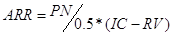 Если показатель РI = I, то это означает, что доходность инвестиций точно соответствует нормативу рентабельности (ставке сравнения). При РI < 1 Расчет коэффициента эффективности инвестиций (ARR) Суть метода заключается в том, что делится величина среднегодовой прибыли (РN) на среднюю величину инвестиции. Сам коэффициент выражается в процентах. Средняя величина инвестиции находится делением исходной суммы капитальных вложении на два, если предполагается, что по истечении срока реализации анализируемого проекта все капитальные затраты будут списаны, если же допускается наличие остаточной или ликвидационной стоимости (RV), то ее величина долина быть исключена. Таким образом, величина этого коэффициента рассчитывается как