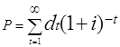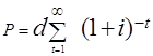где dt - дивиденд, выплачиваемый в t году. i- ставка процентов, учитываемая при оценивании. Как правило, эта ставка весьма близка к средней ссудной ставке на рынке капиталов. Если предположить, что дивиденды постоянны, т.е dt = dt+1…= d= const, то
