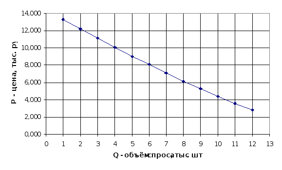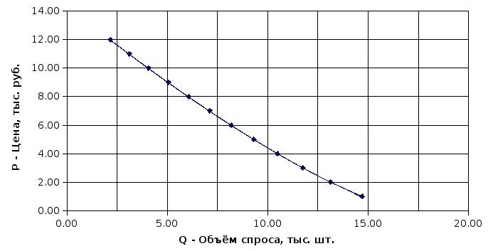 | Спрос, Q | 14.70 | 13.13 | 11.76 | 10.49 | 9.31 | 8.18 | 7.10 | 6.06 | 5.05 | 4.07 | 3.11 | 2.17 | |||