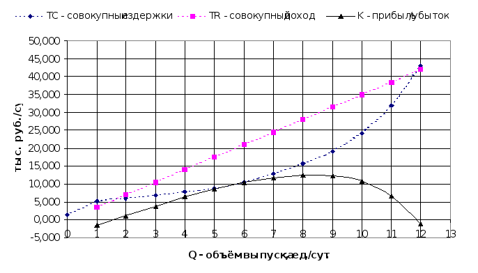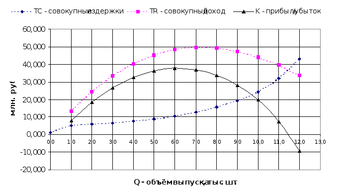 совокупного дохода (TR), совокупных издержек (TC) и прибыли (R) – Рисунок 3;