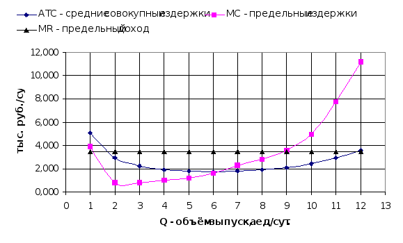 Рисунок 4. График средних совокупных издержек (ATC), предельных издержек (MC), предельных доходов (MR)