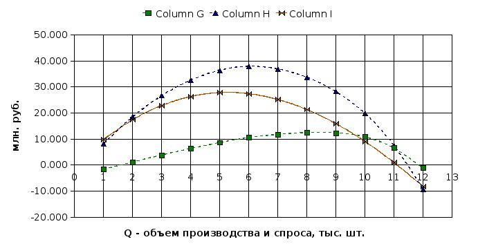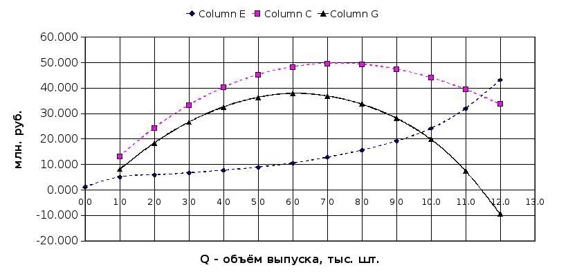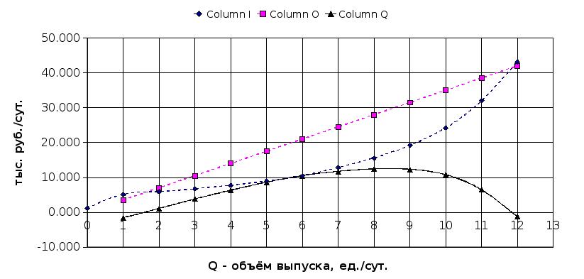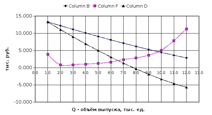 По приведённым ниже формулам произведём расчёт прибыли (убытков) фирмы при различных объёмах выпуска продукции. При расчёте будем использовать равновесную рыночную цену, определённую в предыдущем разделе работы.