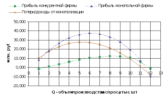Рисунок 7. Графики прибыли конкурентной и монопольной фирмы