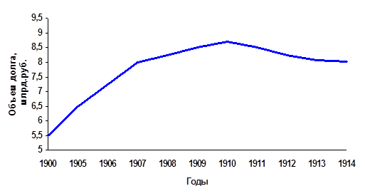 Кредитная история России началась в 1769 г., когда Екатерина II сделала первый заем в Голландии. За последующие два с половиной столетия Российская империя заняла на рынке примерно 15 млрд. руб. Большая часть этих средств накануне революции была погашена. К этому моменту старейшими займами в составе русского государственного долга оставались 6%-ные займы 1817-18 гг. Их нарицательный капитал составлял 93 млн. руб., а непогашенная часть к 1 января 1913г. равнялась 38 млн. руб. На графике отражена динамика государственного долга Российской империи в начале XX в.: сумма задолженности возросла в период русско-японской войны и революции, а затем стабилизировалась.