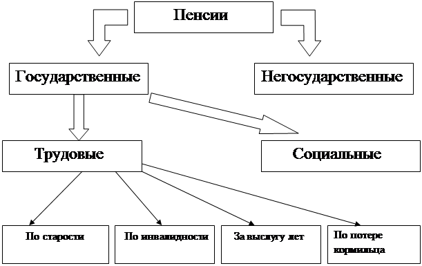 Пенсионное обеспечение - форма материального обеспечения граждан со стороны государства или иных субъектов в установленных законом случаях. Основанием для пенсионного обеспечения по российскому законодательству являются: достижение соответствующего пенсионного возраста, наступление инвалидности, а для нетрудоспособных членов семьи потеря кормильца, для пенсионного обеспечения отдельных категорий трудящихся – длительное выполнение определенной профессиональной деятельности. Надо сказать, что в отличие от законодательства РСФСР, законодательство РФ различает кроме государственной пенсии также альтернативные пенсии, так называемые негосударственные пенсии. Итак, государственная пенсия – пенсия, выплачиваемая гражданину из государственных фондов социального обеспечения. В соответствии с Законом РСФСР «О государственных пенсиях в РСФСР» от 20 ноября 1990г. № 340-1 устанавливаются два вида государственных пенсий: трудовые и социальные пенсии. В связи с трудовой и иной общественно полезной деятельностью, засчитываемой в общий трудовой стаж, назначаются следующие пенсии: По старости, по инвалидности, по случаю потери кормильца, за выслугу лет. Гражданам, не имеющим по каким - либо причинам права на трудовую пенсию устанавливается социальная пенсия. Такая пенсия может назначаться в соответствующих случаях вместо трудовой пенсии (по желанию обратившегося за ней). Негосударственная пенсия – пенсия выплачиваемая гражданину из негосударственных (коммерческих) пенсионных фондов, Как правило, носит дополнительный характер по отношению к государственной пенсии, хотя в последнее время институт негосударственной пенсии все более обосабливается в отдельную категорию социальных выплат, независящую от государственных пенсий. В России институт негосударственной пенсии получил распространение сравнительно недавно, с 1993г. Как было сказано выше, государственные пенсии можно разделить на две категории - это пенсии трудовые и пенсии социальные. Социальная пенсия – государственная пенсия, устанавливаемая гражданам, не имеющим по каким – либо причинам права на пенсию в связи с трудовой и иной общественной деятельностью.