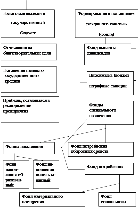 Схема распределения и использования прибыли торгового предприятия. Для дивидендов, на которых полностью отражаются колебания прибыли, характерна неустойчивости. Если акции акционерного общества котируются на фондовой бирже, одним из важнейших ограничителей распределения прибыли становиться их курс. Существенные изменения в размерах выплаченных дивидендов немедленно отражаются на курсе (рыночной стоимости) акции. Поэтому акционерные общества стремятся к тому, чтобы дивиденды не слишком отклонялись от уровня, считающегося нормальным, ориентируясь, как правило, на размер процентов, выплачиваемых Сбербанком по денежным вкладам населения. Направляя значительную долю чистой прибыли на текущие потребности, предприятие снижает темпы экономического роста и, ограничивает возможности будущего потребления. Прибыль направленная на инвестирование (капиталовложения), способствует ускорению экономического роста, тем самым расширяется возможности будущего потребления. Торговля - это наиболее выгодная отрасль капитальных вложений, так как срок их окупаемости сравнительно невелик, а прибыль на вложенный капитал обеспечивает быструю окупаемость вложений. Применение более квалифицированной рабочей силы, прибыльное размещение капитала, внедрение новых технологий бизнеса зависят от такого фактора, как предпринимательская способность руководства предприятия. В общем виде прибыль, остающаяся в распоряжении предприятия. Распределяется на фонды накопления и фонды потребления. Эти фонды различаются по принадлежности к собственникам. На акционерном предприятии фонды потребления находятся в собственности трудового коллектива предприятия, а фонды накопления - в собственности акционеров, учредителей. Поэтому фонды потребления не могут быть отнесены к капиталу предприятия. Различие капитала и фондов состоит в том, что капитал образуется в результате накопления имущества, а фонды накопления - в результате чистой прибыли. Нераспределённая прибыль - принципиально новый показатель, характеризующий экономический рост предприятия на основе собственных средств. В составе нераспределённой прибыли одна часть характеризует величину накопленной прибыли, вторая часть представляет собой свободную прибыль, т.е. прибыль, которая не получила по сути никакого направления. Прибыль, остающаяся в распоряжении предприятия, не может быль полностью отнесена к собственному капиталу. Все фонды потребления, даже такие накопления, как вложения в социальную сферу (например, строительство пансионата), к собственному капиталу не относятся. Это не капитал предприятия в целом виде, а по сути то, что предприятие отдало коллективу на улучшение его социальных нужд. В фондах специального назначения аккумулируется значительная часть прибыли, зарезервированная или направленная на образование источников финансирования затрат на создание нового имущества предприятия производственного назначения и социальной инфраструктуры, а также на нужды социального развития (кроме капитальных вложений), материальное поощрение работников. Фонды социального назначения чётко разграничивают средства, направленные предприятием на производственное развитие и на потребительские нужды. В этой связи образуются две самостоятельные группы фондов: фонды накопления и 