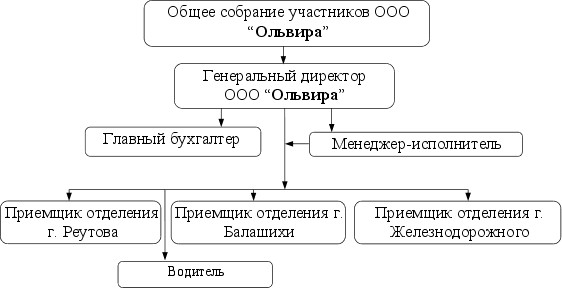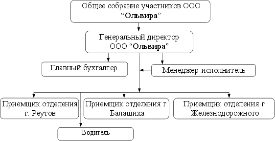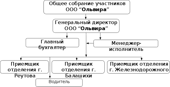 Рис. 1. Организационная структура ООО “Ольвира” Высшим органом управления в ООО “Ольвира” является общее собрание участников - учредителей общества. Собрание решает стратегические вопросы, вопросы распределения прибыли общества, а также избирает Генерального директора. Генеральный директор осуществляет общее управление обществом. Его непосредственным заместителем является менеджер-исполнитель, который занимается текущими производственными вопросами, контролем деятельности приёмных пунктов. Перечень проектных решений.Для достижения поставленных целей предлагается следующий детальный план работ по проекту.