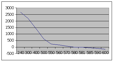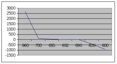 Рис. 9. График чувствительности инновационного проекта к изменению уровня затрат. У = х = 580 + 1,05 / (1,05 + 6,83) * (581 – 580) = 580,13 у.е. %Ч = |240 – 580,13| / 240 * 100% = 142 % При изменении показателя затрат (при его увеличении) наблюдается следующая ситуация: