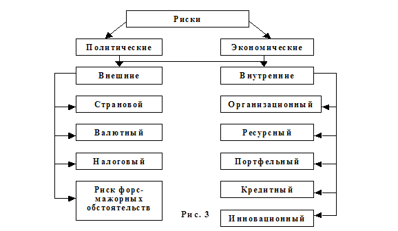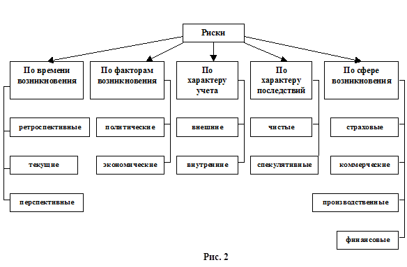 Наиболее важными элементами, положенными в основу классификации рисков, являются: - время возникновения; - основные факторы возникновения; - характер учета; - характер последствий; - сфера возникновения и др. По времени возникновения риски распределяются на ретроспективные, текущие и перспективные. Анализ ретроспективных рисков, их характера и способов снижения дает возможность более точно прогнозировать текущие и перспективные риски. По факторам возникновения риски подразделяются на политические и экономические (коммерческие). Политические риски - это риски, обусловленные изменением политической обстановки, влияющей на предпринимательскую деятельность. Экономические риски - это риски, обусловленные неблагоприятными изменениями в экономике предприятия или в экономике страны.
