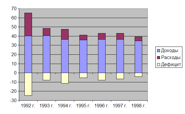 Доходная часть бюджета систематически падает, а расходы государства сокращаются медленнее и недостаточно для того, чтобы установилось бюджетное равновесие. Кроме того, в условиях хронического недовыполнения бюджетных планов по доходам секвестирование расходов проводилось под давлением лоббирующих групп (АПК, ВПК, банковский и минерально-сырьевой сектор и др.). В результате сложилась крайне нерациональная структура расходов, которая не способна обеспечить ни экономический рост, ни поддержание достаточного уровня социально-политической стабильности в обществе. Правительство пыталось (особенно на рубеже 1997-1998 гг.) навести порядок в расходовании бюджетных средств - в основном упорядочить отдельные расходы, выявить и ликвидировать нерациональные расходы. Но проблема сложнее. С одной стороны, государству нужно отказаться от значительной части своих обязательств. Обязательства российского государства (идущие еще от советской эпохи и принятые позже Госдумой - индексация зарплаты бюджетников, детские пособия, выплаты офицерам при увольнении в запас или отставку, долги бесчисленных бюджетных организаций по оплате топлива, энергии и т.п.) в рамках федерального бюджета составили в 1998 г. около 25% ВВП, в рамках консолидированного бюджета - 45-50%, что непосильно для российской экономики (и для процветающей германской многовато: Германия намерена к 2000 г. сократить госрасходы с 50 до 46%). Наличие таких обязательств, даже если они не выполняются, порождает неплатежи и подрывает авторитет государства. За 1992-1999 гг. расходы консолидированного бюджета (по отношению к ВВП) уменьшились на оборону и науку, а на социальные цели несколько выросли (правда, реальные расходы государства сократились в 2,5 раза, а на социальные нужды значительно меньше - сокращение примерно на треть). С другой стороны, существуют серьезные ограничения на дальнейшее сокращение расходов. Сказывается сложившийся в советское время и ставший привычным уровень государственной поддержки населения. Кроме того, отношение россиян к экономическим преобразованиям во многом определяется динамикой социальных расходов государства. А его расходы на поддержание высокого уровня образования населения отражаются на темпах экономического роста. Важно и то, что дальше уменьшать расходы на управление, оборону, правоохранительные органы, дотации региональным бюджетам вряд ли удастся без предварительных радикальных реформ в этих сферах. Что, в свою очередь, требует немалых бюджетных средств. На возможности сокращения расходных обязательств государства серьезно влияет заложенный в Конституцию 1993 года механизм формирования институтов власти. Сильная президентская республика была призвана ограничить популистскую и лоббистскую активность законодателей. Однако на практике независимость от Государственной Думы не только оградила правительство от популизма, но и поставила депутатов в комфортную и политически беспроигрышную ситуацию, когда парламент не несет ответственности за результаты социально-экономического курса. Особенно болезненно такое положение отражается при прохождении через Госдуму федерального бюджета. У депутатов нет желания делить ответственность с правительством за социальные последствия исполнения нереального по расходам бюджета. Превышение расходов 