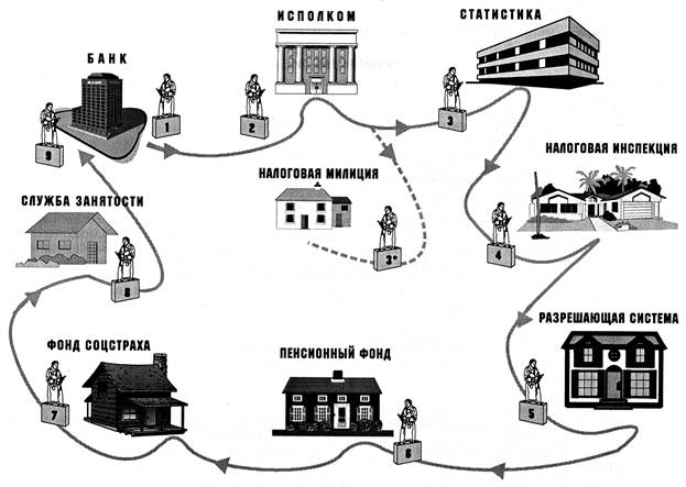 Схема 11) Відкриття в банку тимчасового рахунку для формування статутного капіталу (відкривається тому, що перед реєстрацієй засновники повинні внести частку статутного капіталу). Для відкриття такого рахунку необхідні наступні документи: а) рішення засновників про визначення особи, якій надається право розпорядчого надпису при веденні грошових операцій по цьому рахунку. Це розпорядження оформлюється у вигляді нотаріально засвідченого доручення б) нотаріально засвідчена копія установчого договору в) заява про відкриття рахунка, яка підписана уповноваженою особою г) картка із зразком підпису особи, якій надано право розпорядчого напису. 2) Державна реєстрація суб’єкта підприємницької діяльности проводиться в районному виконавчому комітеті районної Ради. Для цього необхідно мати: а) нотаріально засвідчений статут (два оригіналу і одна копія) б) нотаріально засвідчений установчий договір (два оригіналу і одна копія) в) протокол збору учасників г) реєстраційна картка встановленого зразку (оригінал і чотири копії) д) документ, який засвідчує внесення платні за державну реєстрацію є) довідка, яка засвідчує сплату кожним власником внеску в статутний капітал ж) документ, який засвідчую наявність у засновників у власності або в користуванні приміщення, частки приміщення (договір купівлі-продажу, дарування, оренди і т. д.) 3*) Реєстрація в податковій міліції. Хоча така реєстрація прямо не передбачена нормативними документами, але у наказі ДНАУ від 19.02.98 № 80 вказано лише, що перевірку паспортних даних засновників здійснюють підрозділи податкової міліції. Для цього необхідно мати: а) нотаріально засвідчена копія статуту б) дві заповнені реєстраційні картки в) документ, який підтверджує юридичну адресу г) ксерокопія паспорту директора. 3)Реестрація в органах статистики. В управлінні статистики необхідно отримати довідку про внесення до Єдиного державного реєстру підприємств та організацій України. Для цього необхідно: а) свідоцтво про державну реєстрацію (оригінал і ксерокопія) б) статут (оригінал) в) установчий договір (оригінал) г) заповнена облікова картка ЄДРПОУ (яку необхідно отримати у статуправлінні) д) документи, які підтверджують сплату збору за видачу справки Також необхідно знати індифікаційний код підприємства, який вказують у виконавчому комітеті при видачі свідоцтва про державну реєстрацію. 4) Реєстрація у податковій інспекції. Прийняття на облік суб’єкта підприємницької діяльності проходить в податковій інспекції того району де була здійснена державна реєстрація такого суб’єкта. Стати на облік в податковій інспекції необхідно в 20 денний строк з моменту державної реєстрації. Для взяття на олік у ДПІ необхідно мати такі документи: а) заяву по формі №1-ОПП (заповнюється печатними буквами) б) оригінали та копії установчого договору та статута з відміткою виконкома про реєстрацію в) оригінал та копію свідоцтва про державну реєстрацію суб’єкта підприємницької діяльності г) оригінал і копія документа, який підтверджує юридичну адресу д) нотаріально засвідчину копію довідки про включення в ЄДРПОУ Для того, щоб ці документи прийняли при собі гнеобхідно мати для пред’явлення: – паспорти власників, засновників (фізичних осіб), директора та головного бухгалтера; – довідки про присвоєння їм індентифікаційних кодів 