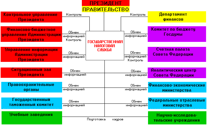 Рис. 1 Взаимодействие Госналогслужбы с министерствами и ведомствами по формированию налоговой политики Взаимодействие можно рассматривать в двух аспектах. В широком смысле - это деловое сотрудничество нескольких государственных органов в обеспечении экономической безопасности в пределах конкретной территории. Такое взаимодействие осуществляется путем разработки и принятия совместных документов (приказов, инструкций, комплексных и целевых программ, договоров, соглашений, планов), которыми определяются приоритетные направления, формы, методы, сроки совместных действий; проведения межведомственных совещаний, семинаров; осуществления согласованных мер по повышению деловой квалификации сотрудников; обмена положительным опытом работы; проведения совместных рейдов, проверок и т.д. Под взаимодействием в узком смысле понимается координация действий подразделений внутренних дел с налоговыми инспекциями, Федеральной службы безопасности, следователем, прокурором в конкретных эпизодах борьбы с экономическими преступлениями, раскрытии налоговых правонарушений и коррупции. Основными задачами взаимодействия являются: - выявление, раскрытие и расследование налоговых преступлений; - привлечение к установленной законом ответственности лиц, совершивших налоговые преступления и обеспечение полного возмещения материального ущерба, причиненного ими государству; - розыск лиц, совершивших налоговые преступления и скрывшихся от следствия и суда; - профилактика налоговых правонарушений; - выявление и пресечение фактов коррупции в налоговых органах и подразделениях налоговой полиции, обеспечение безопасности деятельности сотрудников этих служб; - повышение деловой квалификации кадров. Правовую основу взаимодействия составляют: уголовно-процессуальный кодекс России, Указы Президента РФ, ведомственные (межведомственные) приказы и инструкции, а также межведомственные договоры и соглашения. В процессе взаимодействия стороны должны исходить из ряда общих положений (принципов). Важнейшими из них являются: - соответствие совместной деятельности требованиям закона и подзаконных актов. Стороны не могут решать задачи, запрещенные соответствующими нормативными актами, выходить за пределы своей компетенции, использовать формы, средства и методы, не предусмотренные законом; - самостоятельность каждой из сторон в выборе дозволенных законом средств и методов деятельности, в частности оперативно-розыскных, и полная ответственность за их результаты. Взаимодействие не должно приводить к командованию, а тем более подмене одного органа другим; - взаимное доверие сторон при строгом соблюдении каждой из них государственной и служебной тайн, неразглашении иных сведений, охраняемых законом. Стороны должны обеспечивать, необходимую конфиденциальность, не допускать разглашения сведений о совместных мероприятиях, используемых силах и средствах, сохранять и, в установленном порядке, использовать полученную информацию и материалы. Любую информацию, затрагивающую интересы другой стороны, передавать иным организациям только по согласованию с нею; - непрерывность взаимодействия. Сторонам целесообразно согласовывать перспективное и текущее планирование по конкретным направлениям совместной деятельности, объектам налогообложения, 
