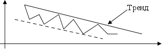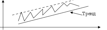 Т який зростає Час Рис.1. Динаміка цін цінних паперів певної групи Наближення графіка до ліній тренду сигналізує про найсприятливіший момент для продажу (якщо тренд знижується) або купівлі (якщо тренд зростає) акцій. При цьому можна зіставити рівні цін з часом проведення операцій, днями тижня чи сезонним фактором. Коли ускладнити графік, поповнивши його інформацією про обсяги продажу, удається виконати й глибший аналіз ситуації. Графічний аналіз — засіб обгрунтувати момент проведення операції, проте він не дає змоги встановити, щодо якої акції цю операцію слід застосувати. Для вибору акції можна поряд з описаним традиційним скористатися сучасним технічним аналізом, який передбачає порівняльний аналіз динаміки та варіації показників ринку щодо певного набору цінних паперів, з якого цей вибір потрібно зробити. Уважається за доцільне купувати акції, щодо яких протягом попереднього періоду спостерігалися такі закономірності: 1. Сталий рівень показників: